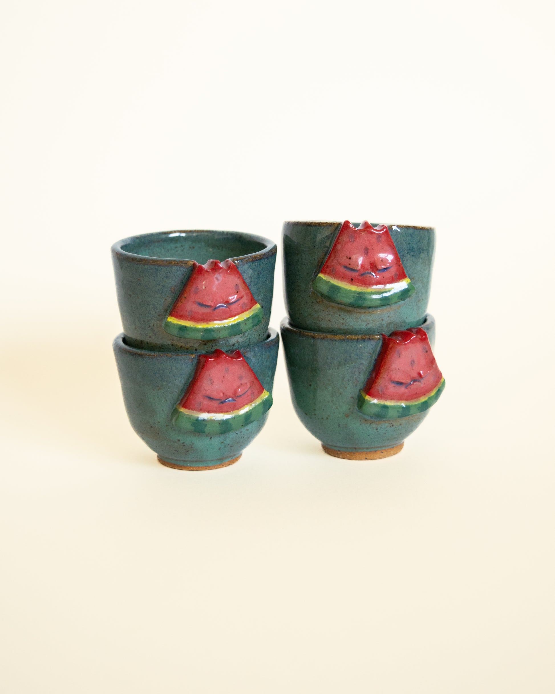 This blue-green shot cup is adorned with a very angry watermelon slice. This cup will bring a playful twist to espresso shots or alcoholic shots.