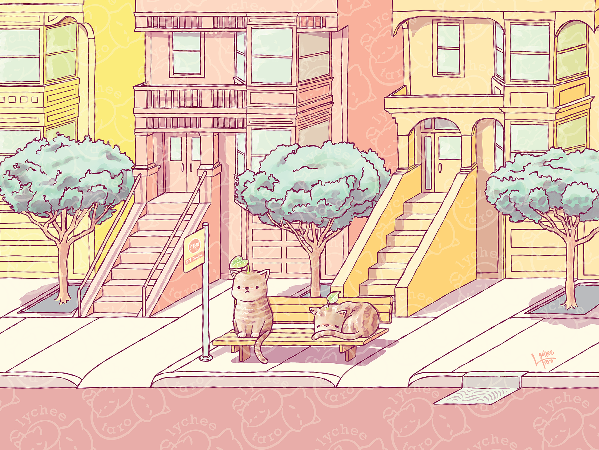 Two lazy potato cats, Taro and Tato, take their first adventure outside. Their first task is to catch the bus. As they patiently wait, Taro enjoys the San Francisco scenery, admiring the iconic Victorian houses. Meanwhile, Tato seizes the opportunity to nap. This adorable wallpaper is a reminder of the joy of beginning an adventure, even in the most mundane moments.